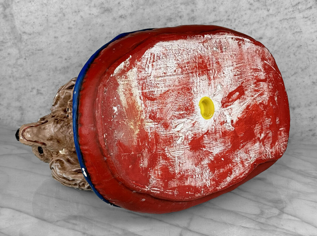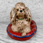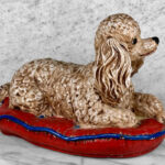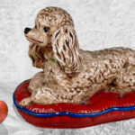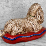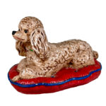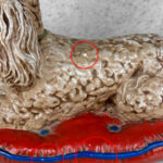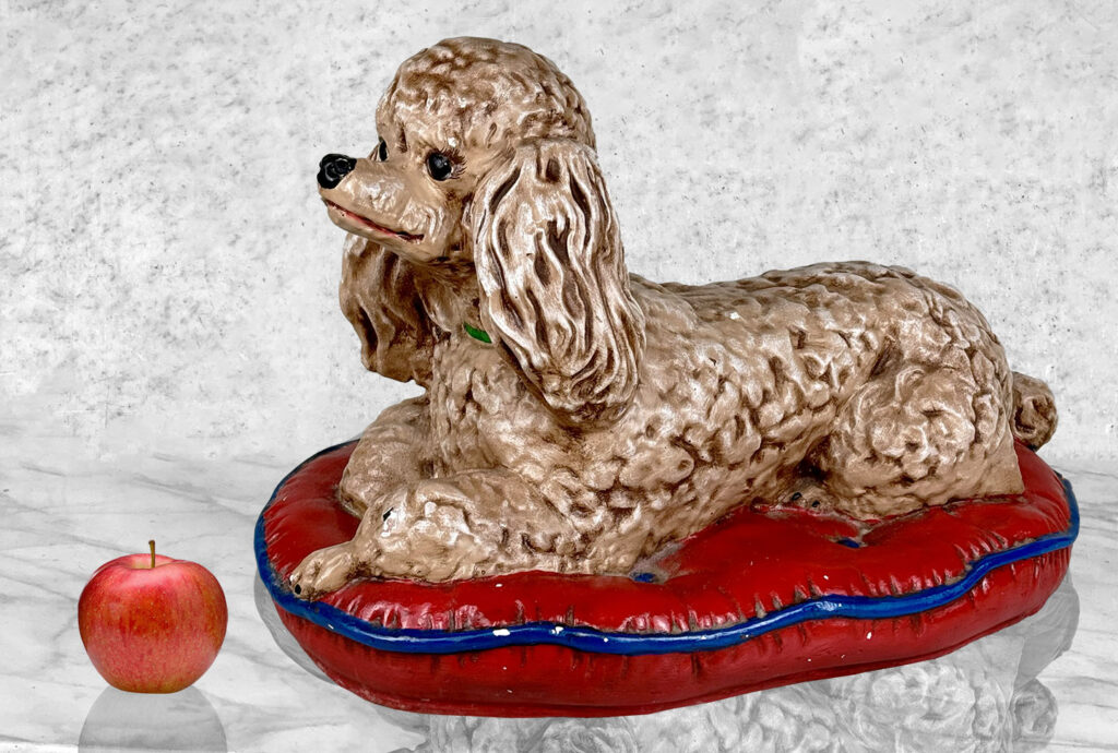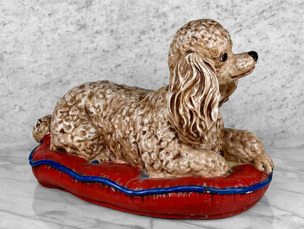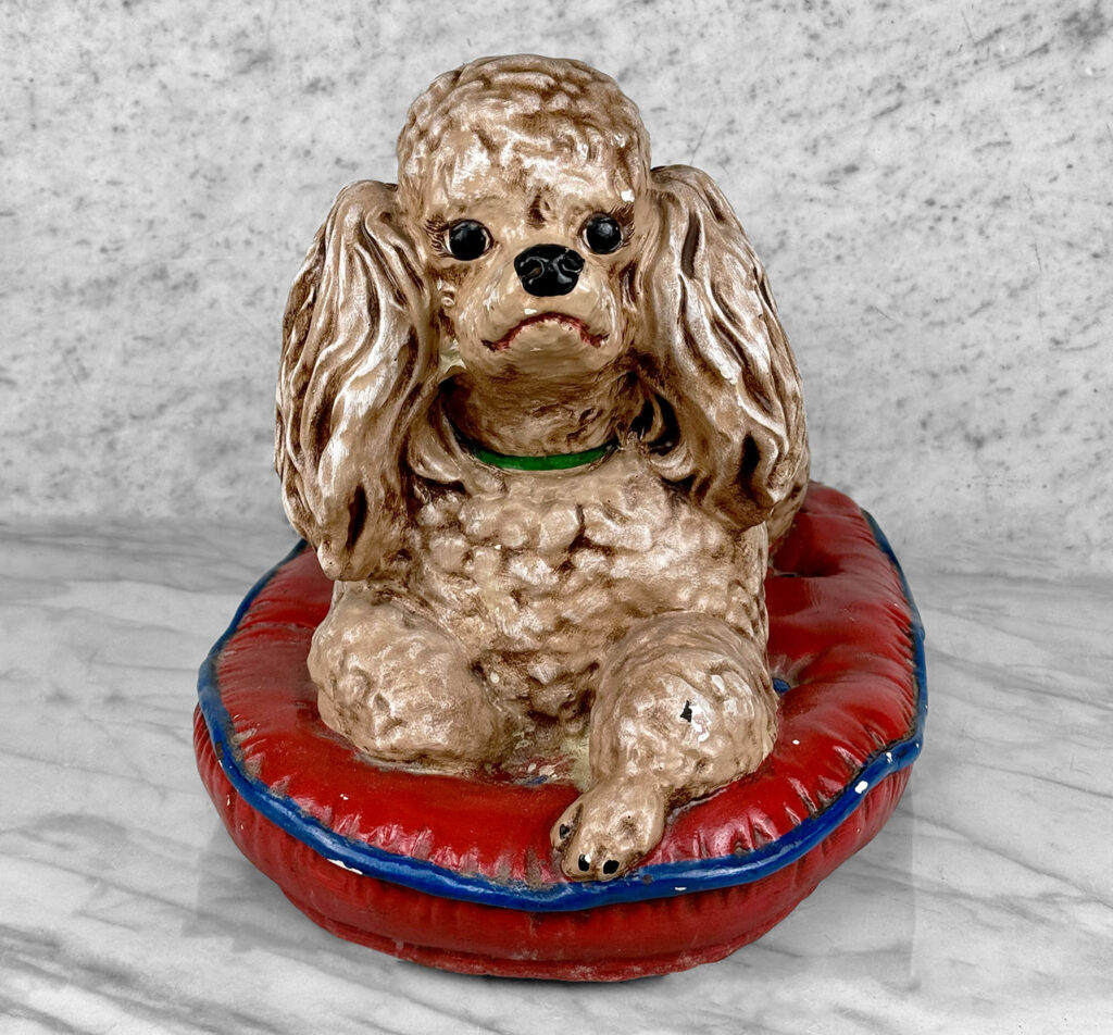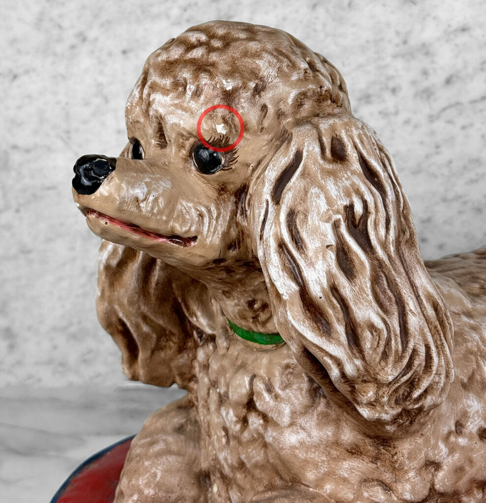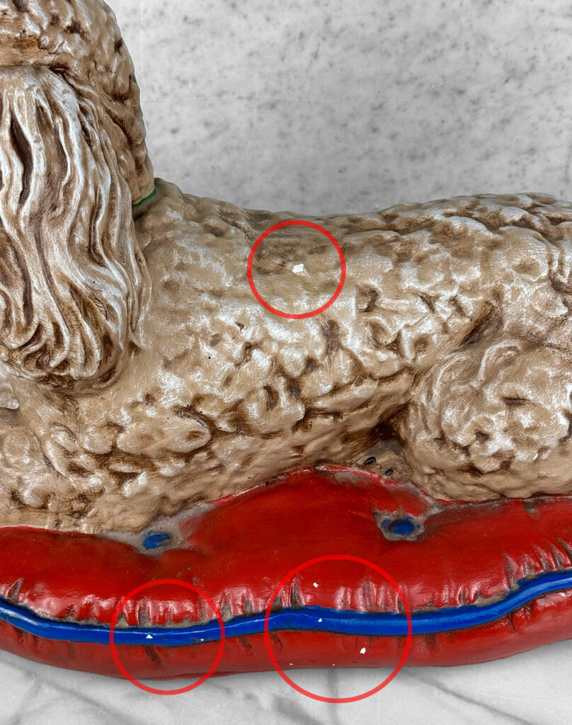 This Chalkware Poodle Sculpture is in overall good condition without any repairs shown. A series of fleabites can be seen along the surface, we’ve circled these areas in our photo gallery to reference.