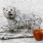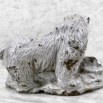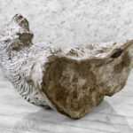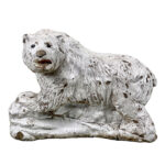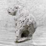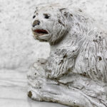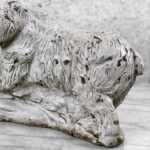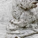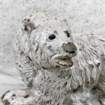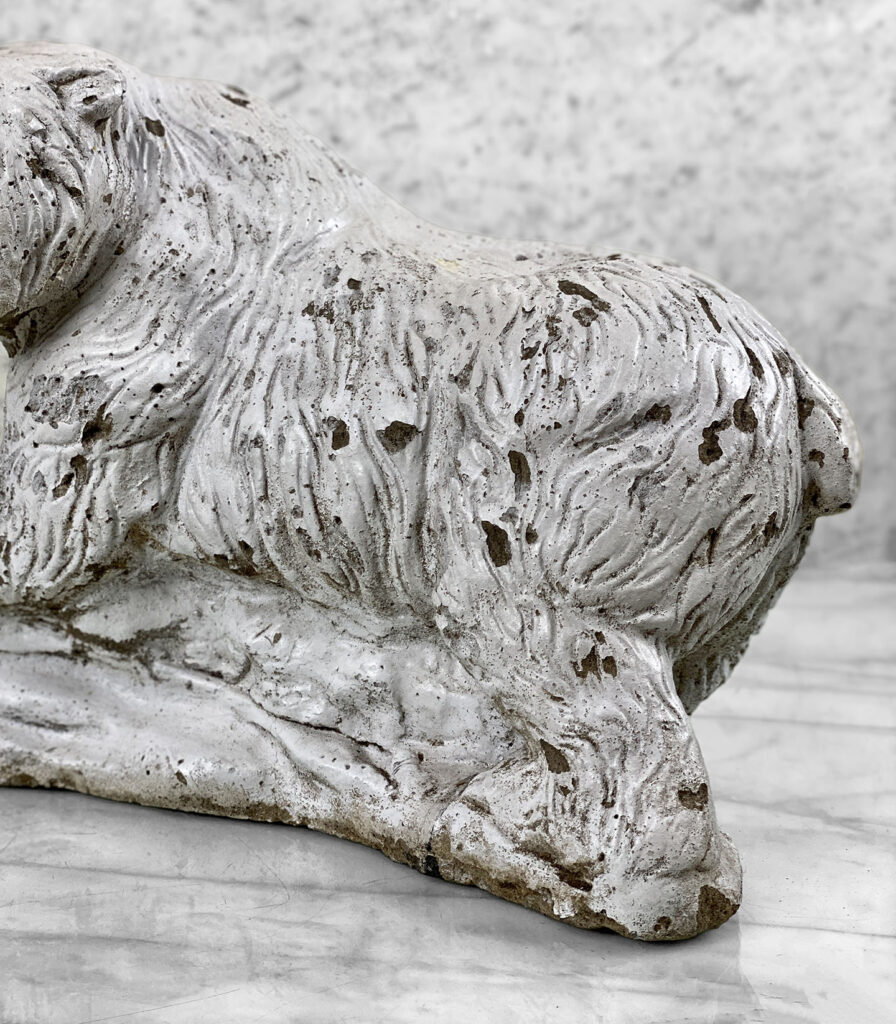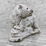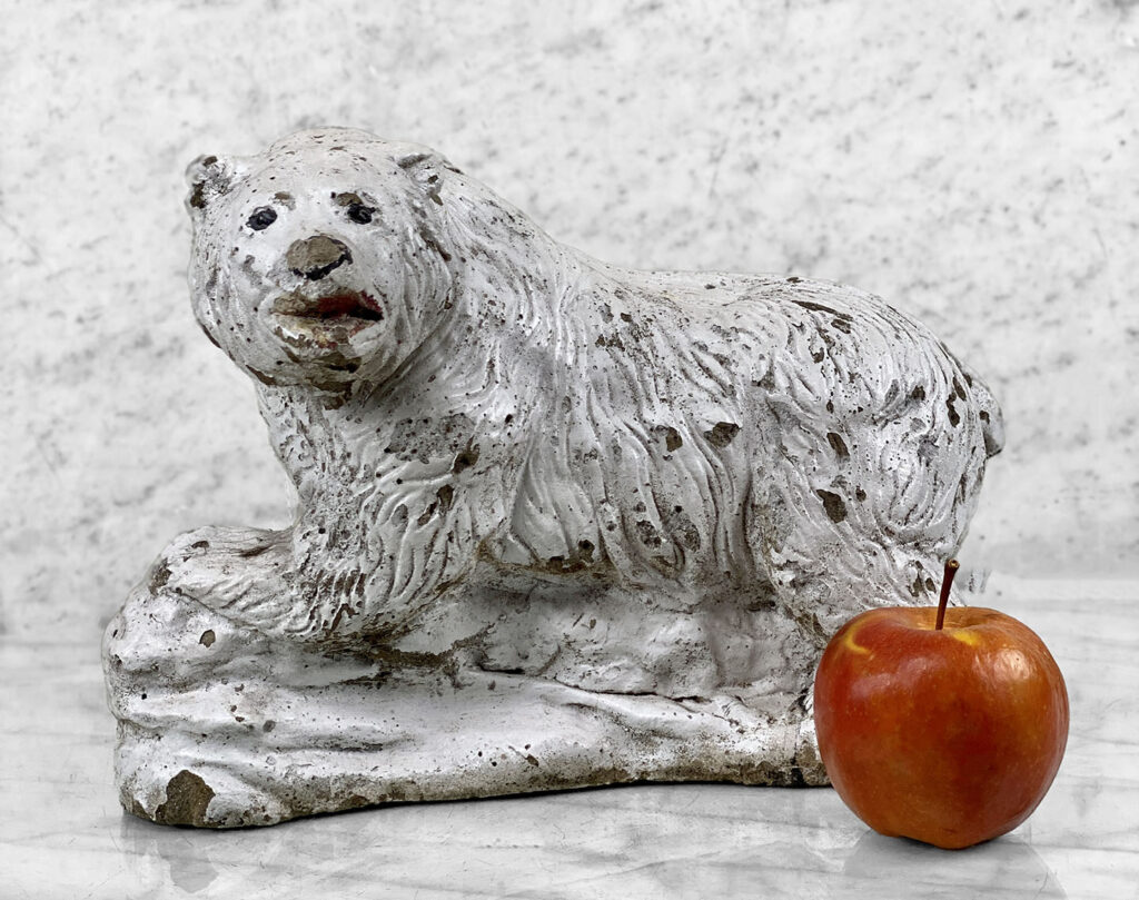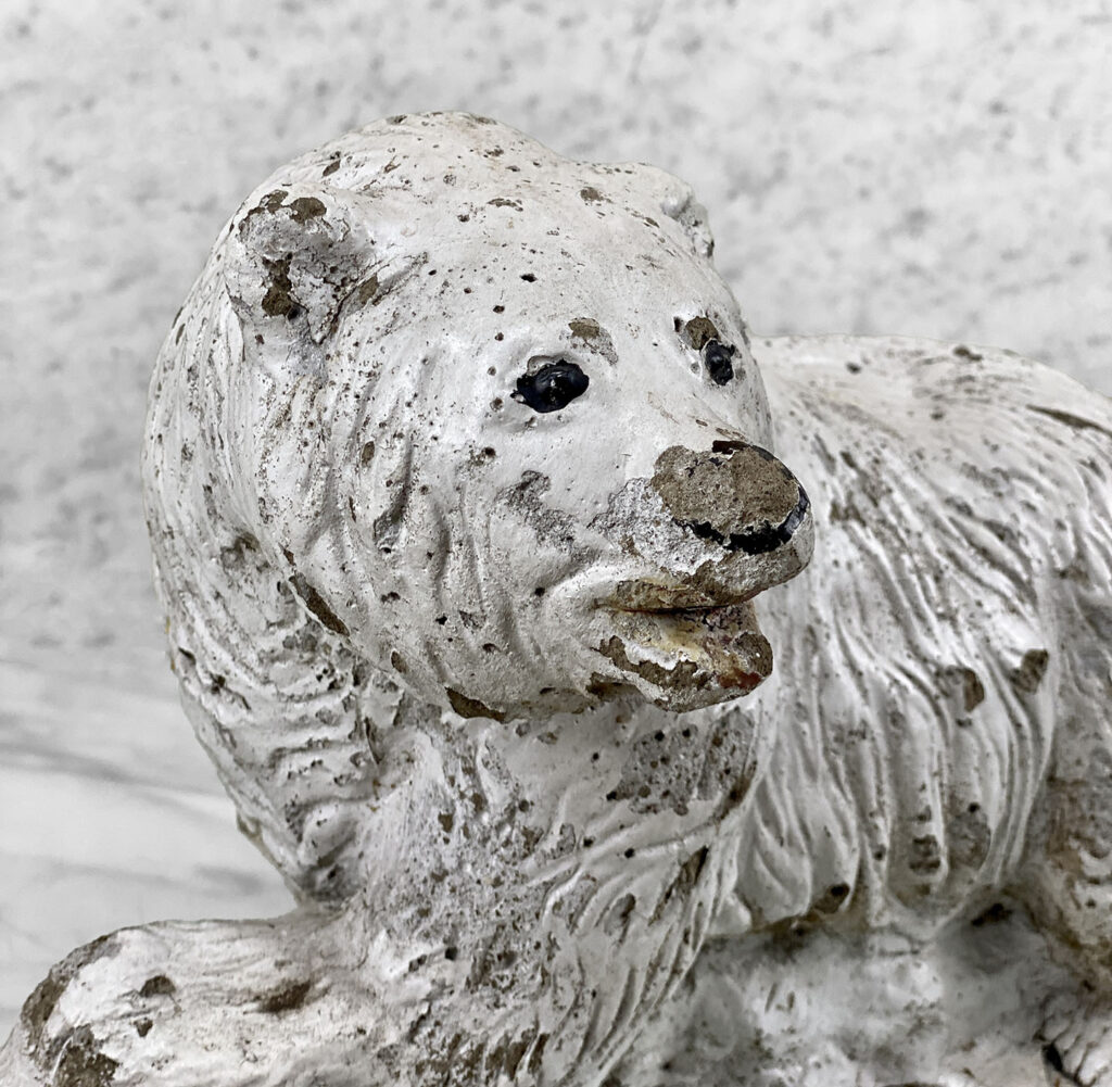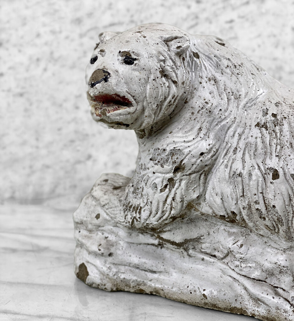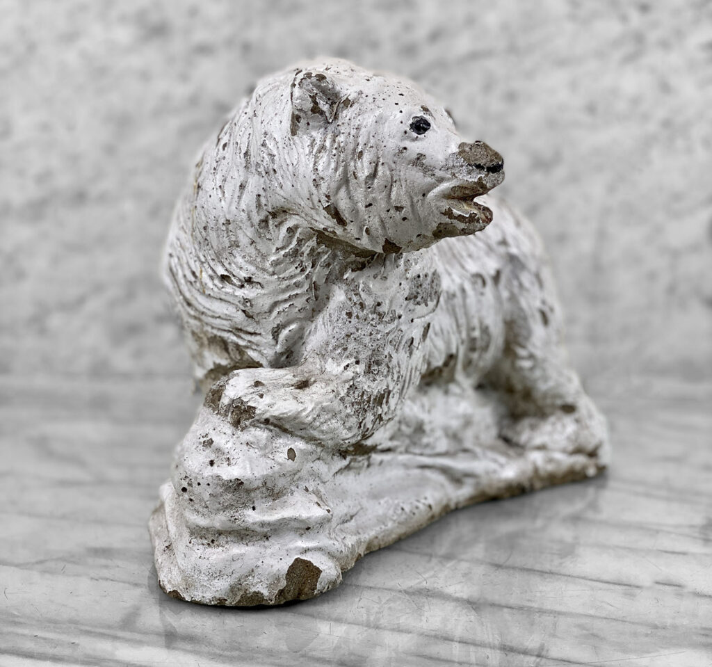 This Concrete Polar Bear Sculpture is heavily weighted. The piece is nicely aged with great character, showing chips, surface scratches and blemishes throughout. There aren’t any major cracks and no repairs shown.