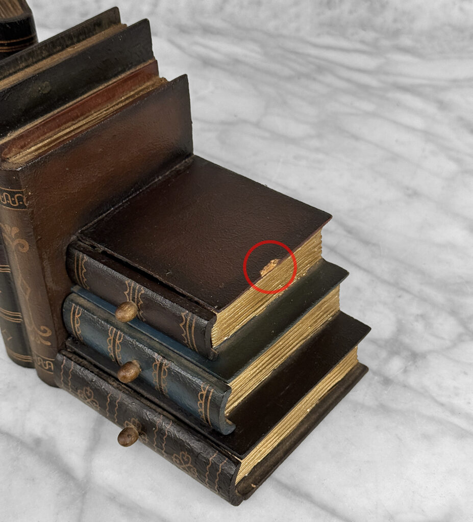 Overall good condition and looks great while staged. Each drawer opens as they should. A chip to one of the bookends finish can be seen. We’ve circled this area in our photo gallery to reference.