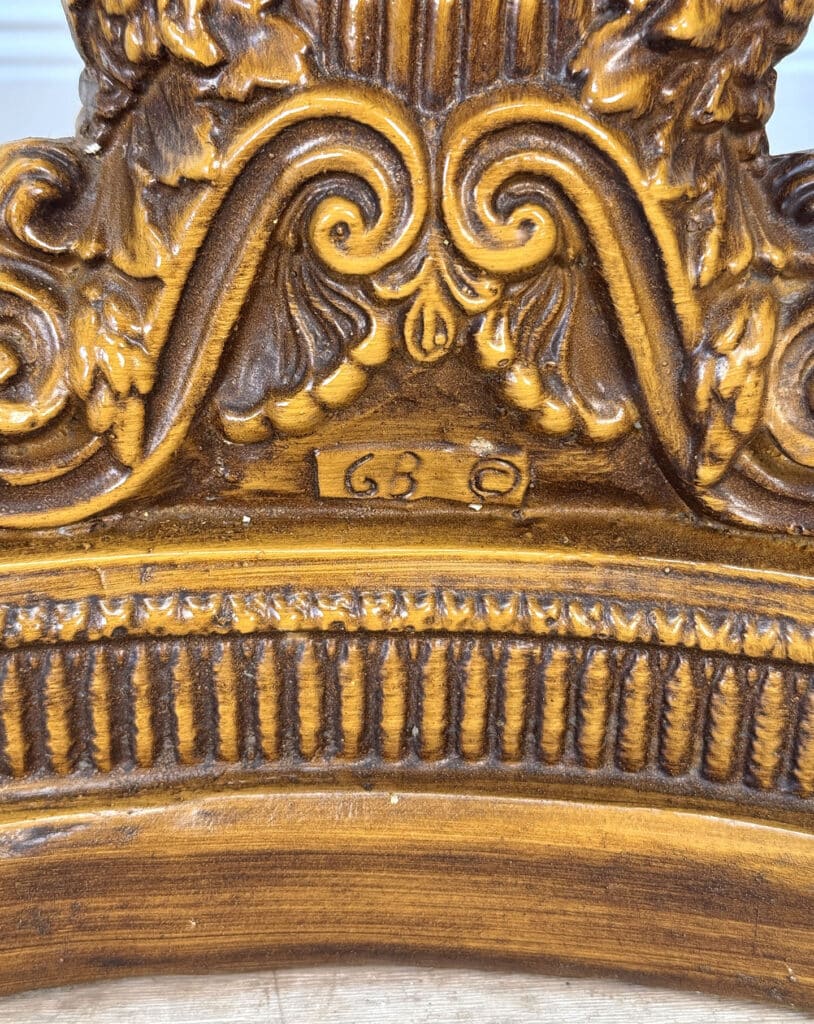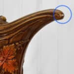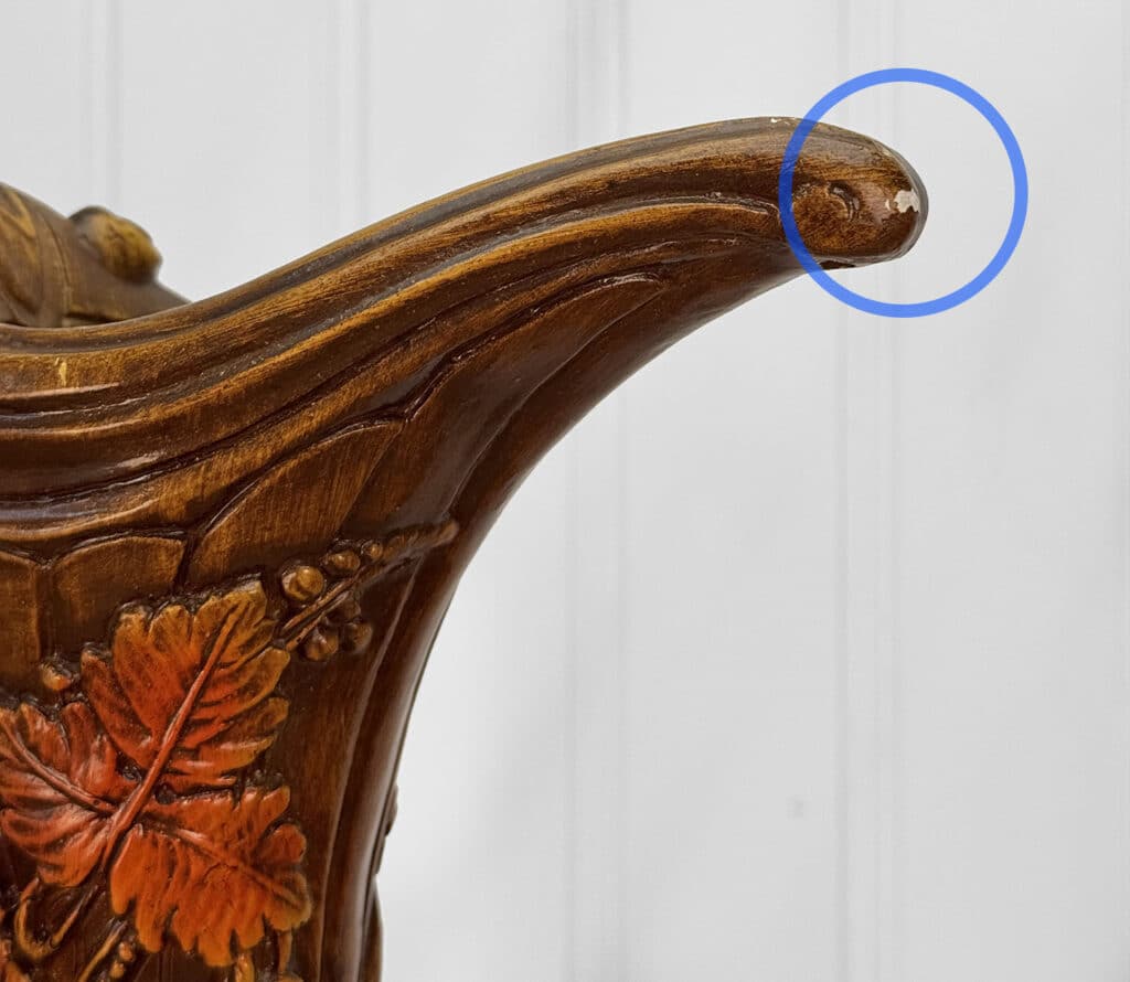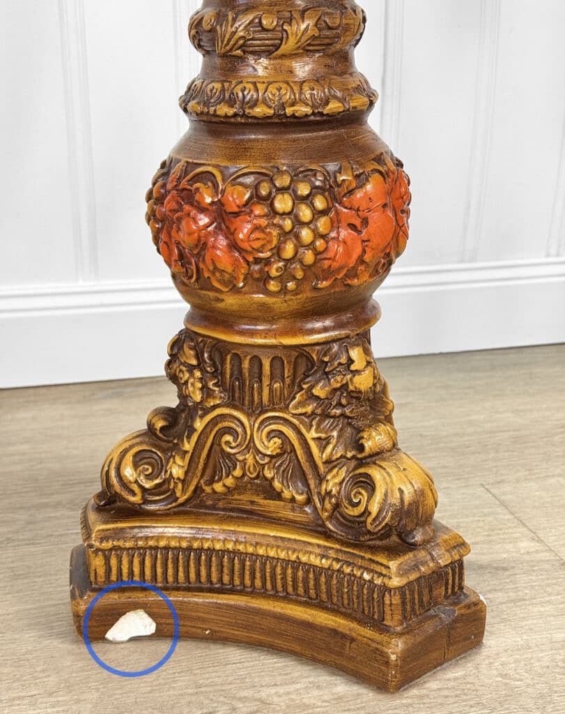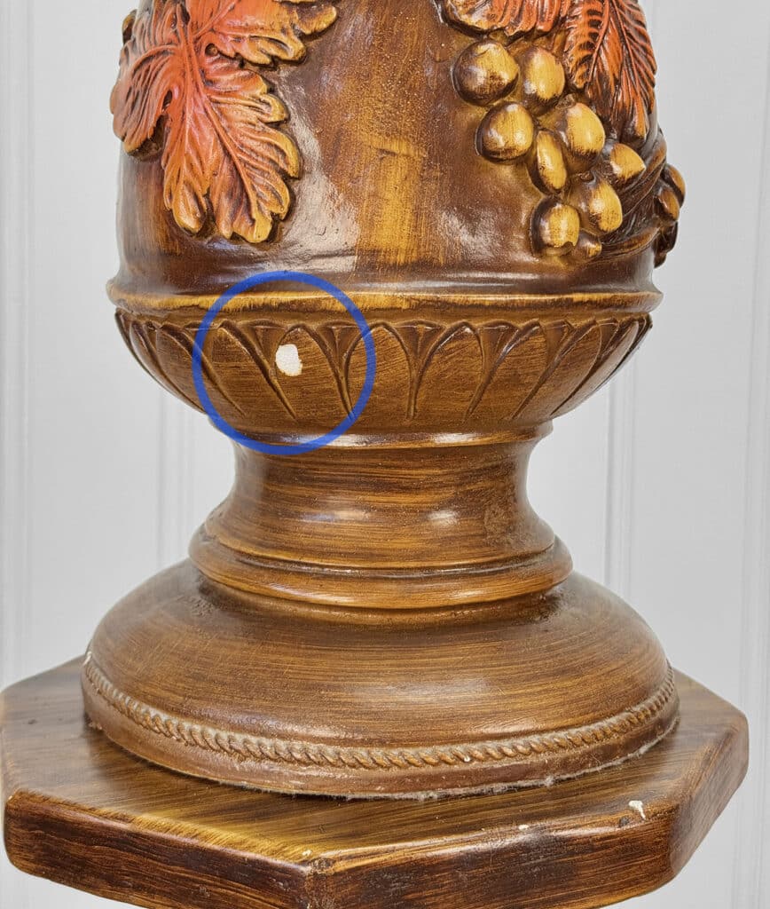 This Ewer & Pedestal does not show any repairs, although areas of chips can be seen. Notable areas are circled in our photo gallery to reference. This Pedestal looks great while displayed. Consider the chips to be shown on the backside.