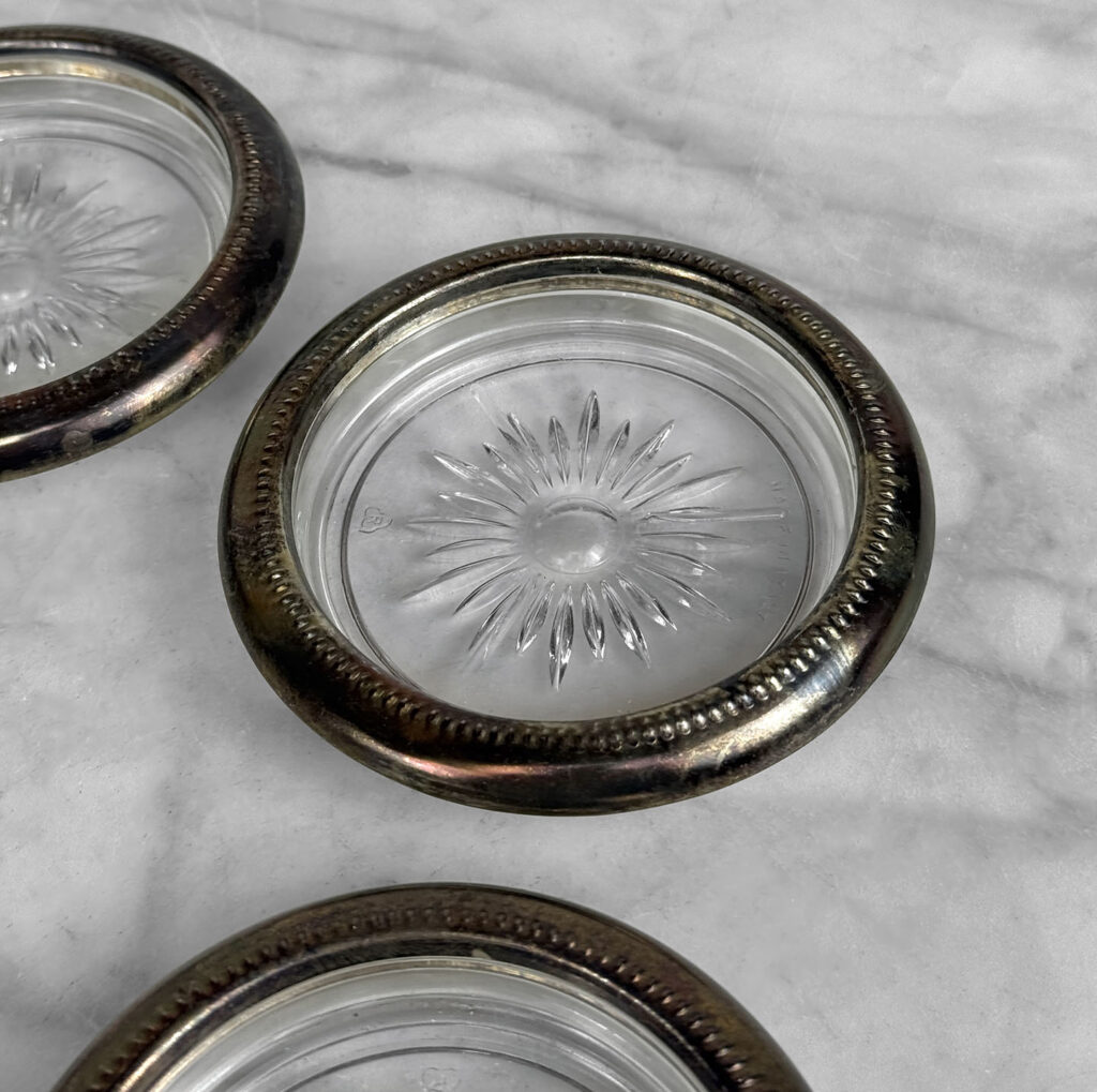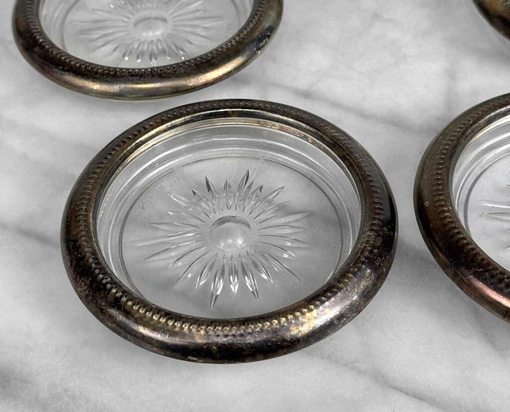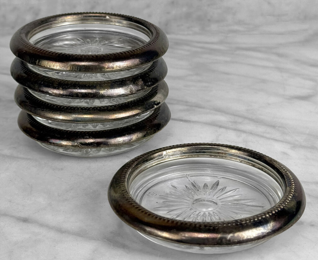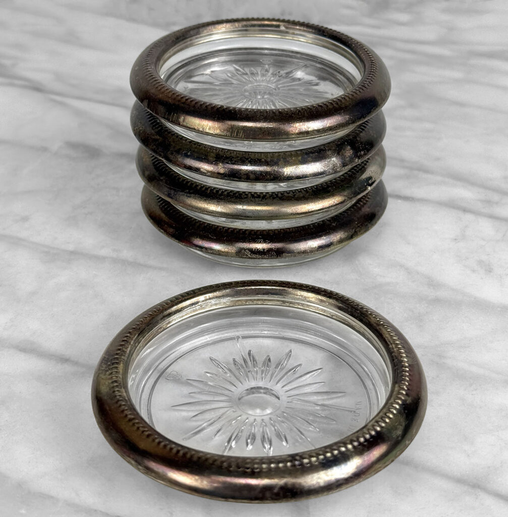 Really nice set, looks great while staged and stacked. Tarnishing to the silverplate can be seen to each coaster. The glass bottoms are free of any cracks or chips.