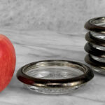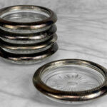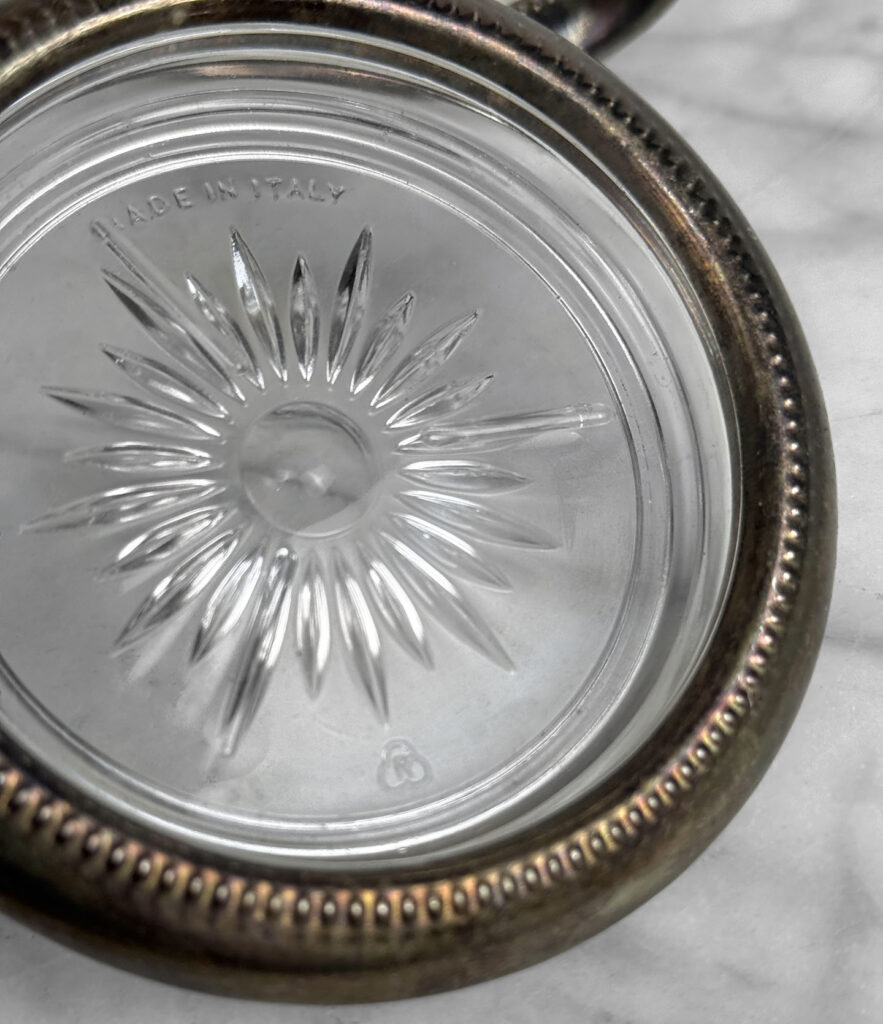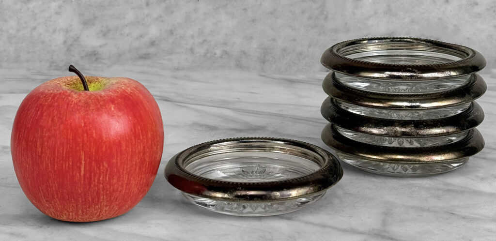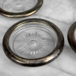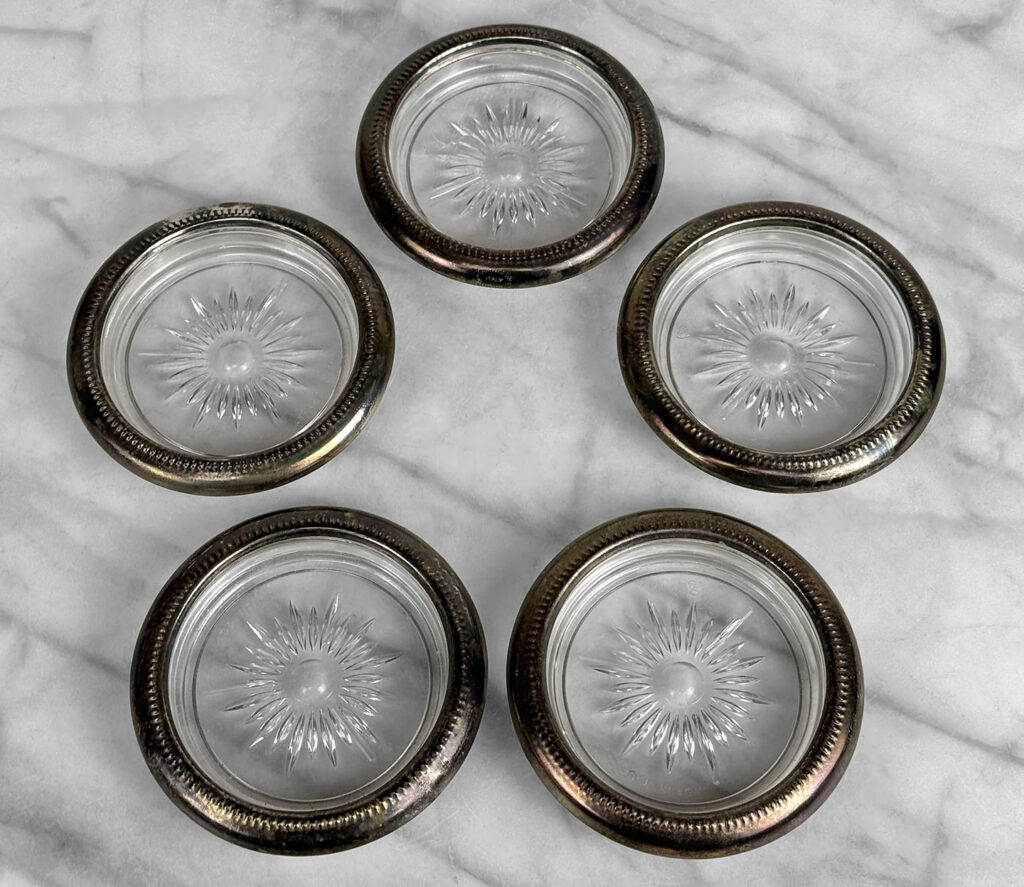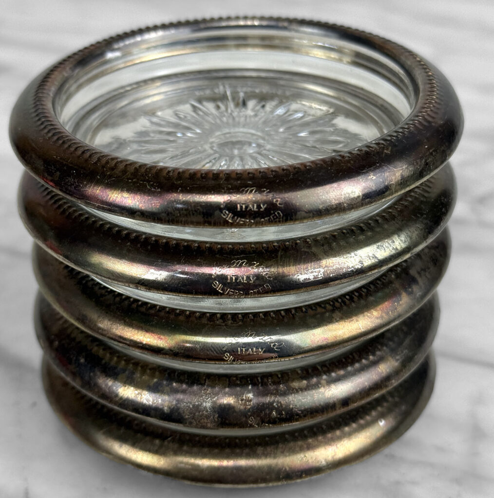 Really nice set, looks great while staged and stacked. Tarnishing to the silverplate can be seen to each coaster. The glass bottoms are free of any cracks or chips.