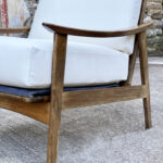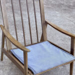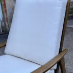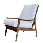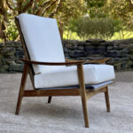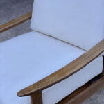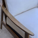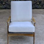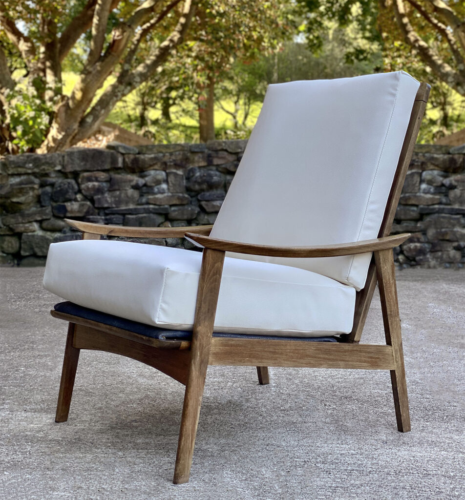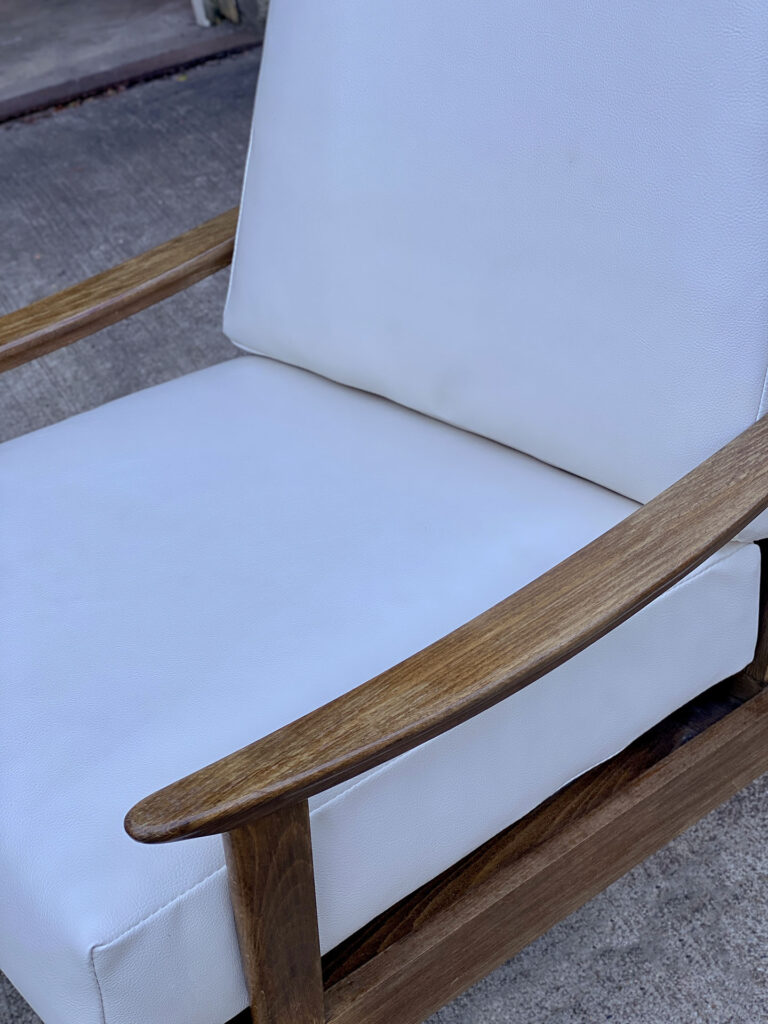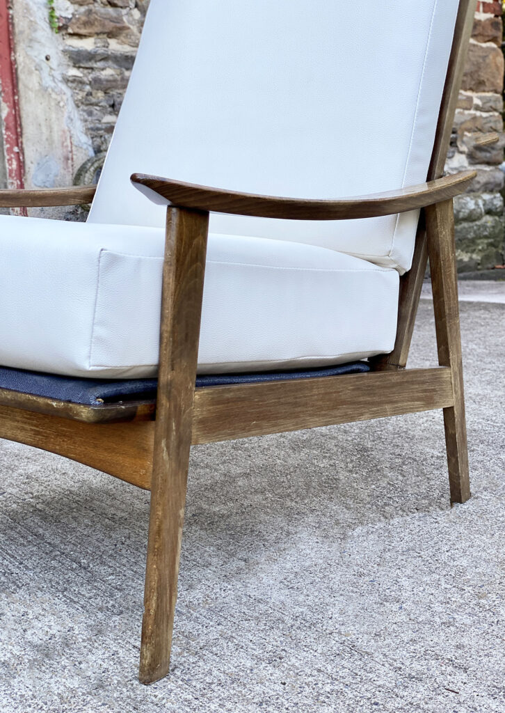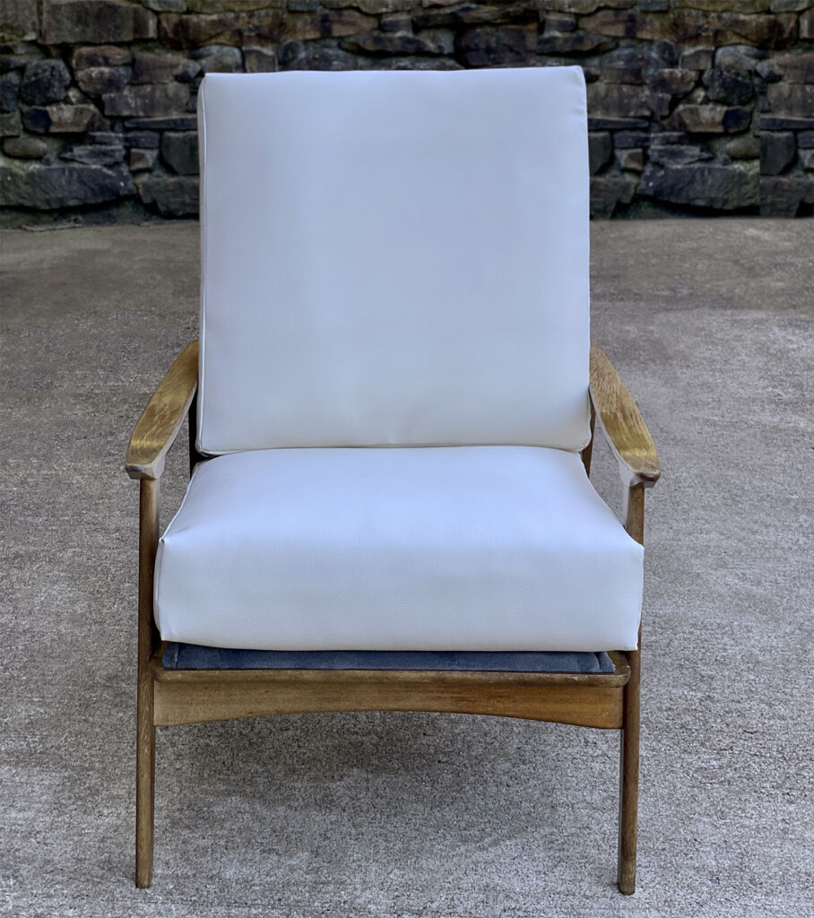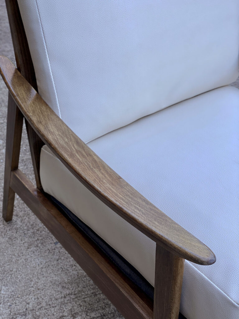 This Mid-Century Yugoslavian Lounge Chair was exceptionally well made, it’s solid and sturdy. The wood finish shows mild surface scratches and blemishes to the finish, mostly seen along the tops of the arms. The seat cushions were just professionally reupholstered in an ivory pebbled vinyl. The vinyl is of a very high quality and cleans great for longevity.